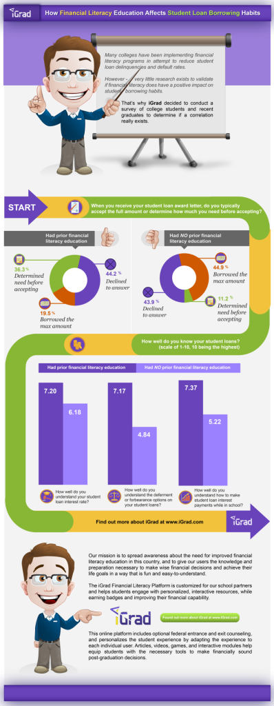 Financial Literacy is a hot topic in the realm of higher education, but there has not been much research to identify the effect it has on financial decisions and student loan borrowing practices. That’s why iGrad recently conducted a survey of college students and recent graduates. The results are presented in this infographic. (Click the image to see an enlarged version)