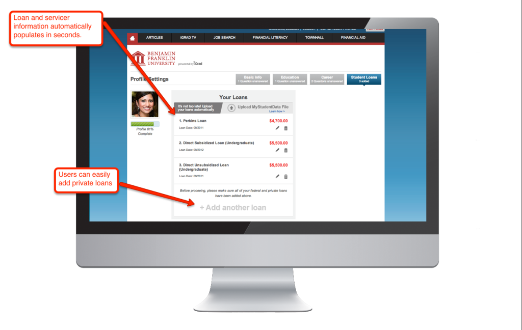 We’ve moved this tool to every user’s iGrad profile settings. Now all users can easily synch their student loans with iGrad. We will be developing many complementary features that will offer students helpful tools and reminders related to their loans, as well as new reports available in iGrad’s administrator console. In tandem with the new loan upload tool, we’ve launched a feature to add a user’s total student loan balance and servicer information to every page of their iGrad profile. We will be making this a more expansive and user-friendly widget in the weeks to come!
