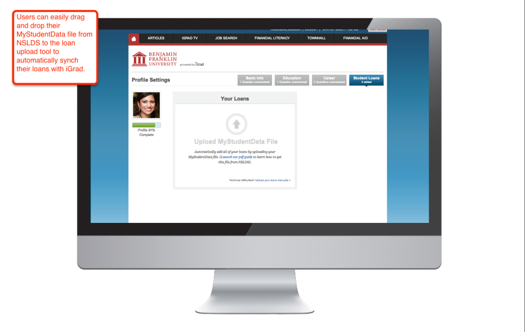 Our partners who utilize iGrad’s federally compliant, video-based Exit Counseling Course already know about our awesome Loan Upload tool. The user feedback from our loan upload feature has been amazing: although it’s an optional feature, 91.5% of users going through our Exit Counseling Course use the tool to automatically synch their federal loans, by dragging and dropping their NSLDS MyStudentData file directly to the tool.